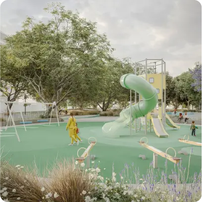 Ecoparque: El corazón natural de este Distrito Joven. Un gran espacio parquizado donde el verde predomina, pensado para conectar con la naturaleza, hacer actividad física o simplemente disfrutar del aire libre. Senderos peatonales rodeados de vegetación autóctona, zonas de descanso, sectores para juegos al aire libre y espacios para actividades recreativas invitan al encuentro cotidiano con el entorno.